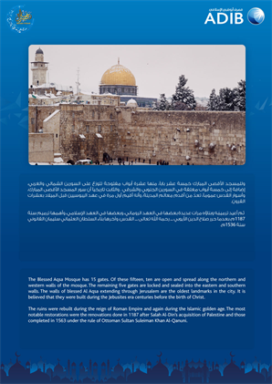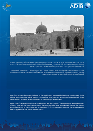 The sacred mosque is the site of the first Qibla. The al-Aqsa Mosque is located on “The Noble Sanctuary”. It includes all the constructed archeological and historical components, like the “Dome of the Rock”, the ceiled Aqsa Mosque, the Dome of the Chain (Silsilah), al-Musalla al-Marwani (the Marwani Chapel) and the Aqsa al-Qadim (the Old Aqsa) and other features that make up the complex.